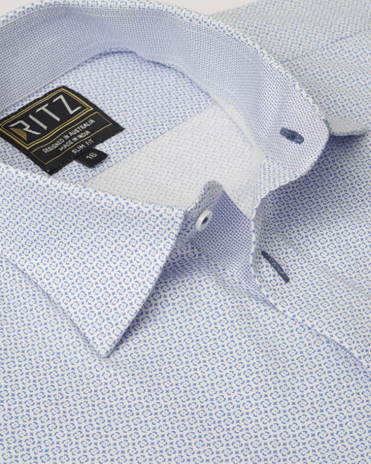 $68.00 / $45 MultibuySpice up your wardrobe with this semi-casual shirt crafted from premium cotton featuring an awe inspiring abstract marble like print in muted blue and aqua green tones on white base. The inner, two tone band and cuffs add to the unique statement of the overall design.