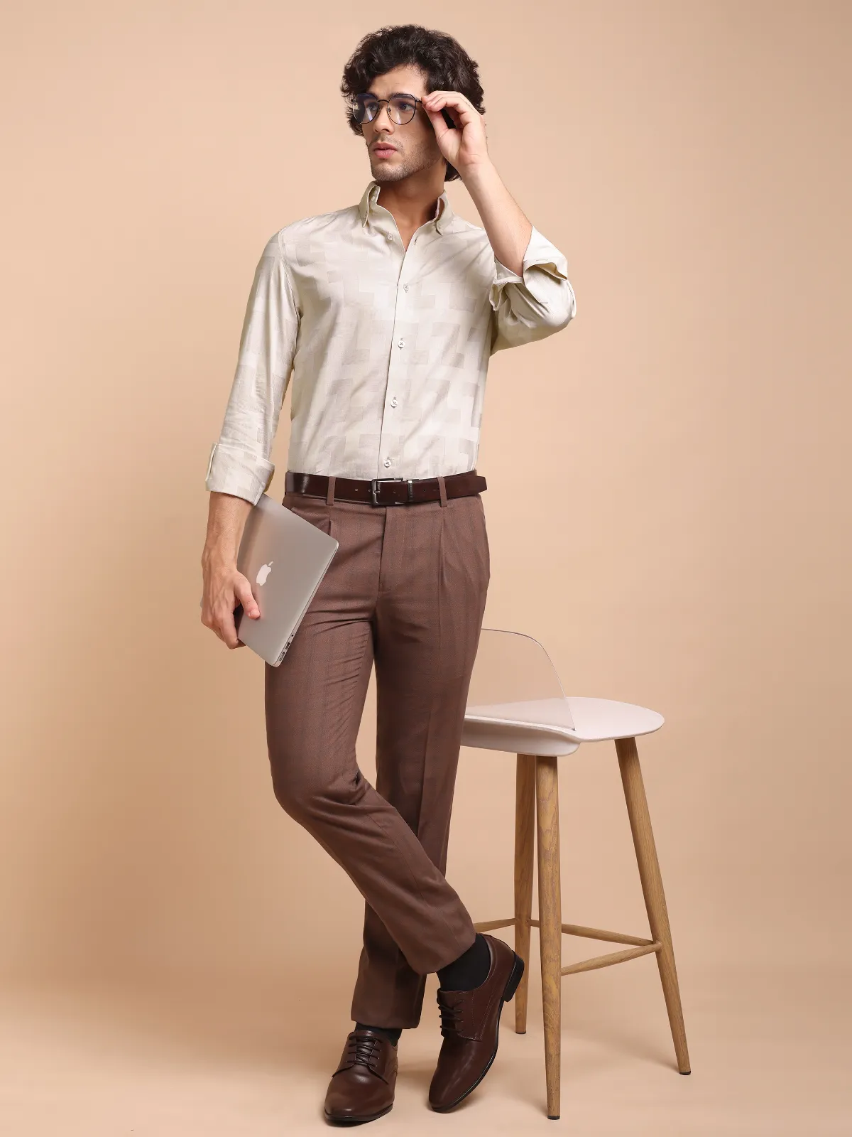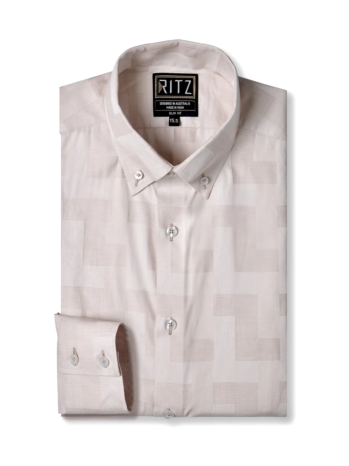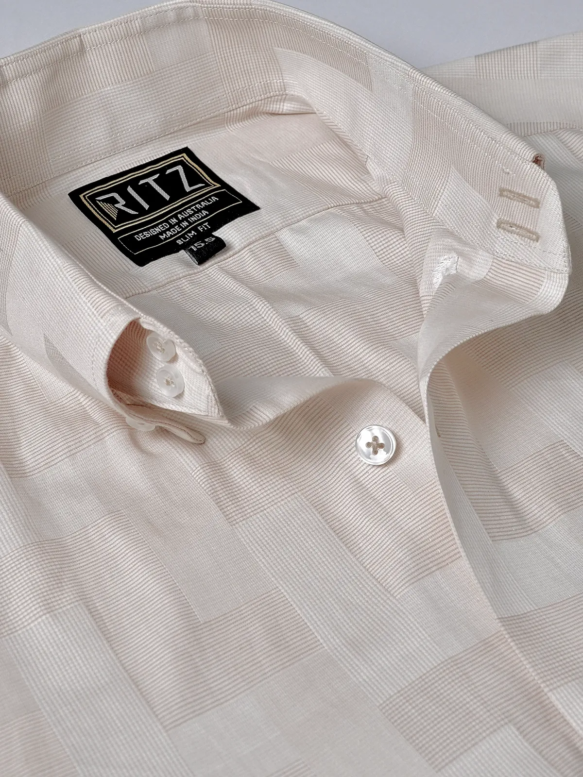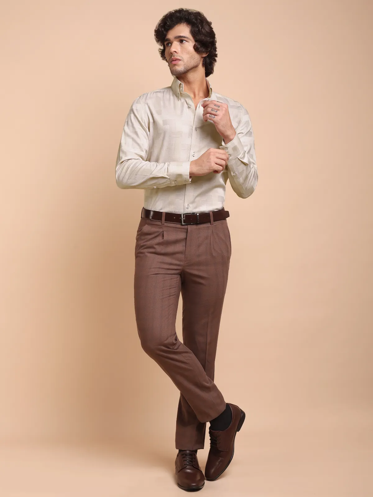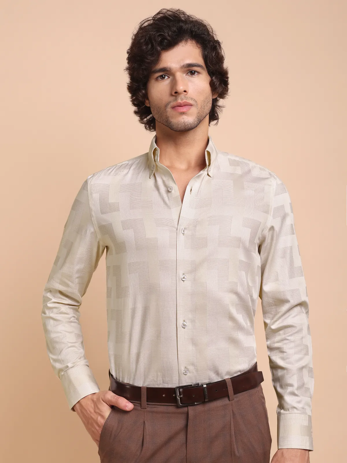 Make a statement with our brushed gold pure cotton shirt, featuring a unique self pattern and a button-down collar. Soft, breathable, and expertly tailored, it blends elegance with modern charm.