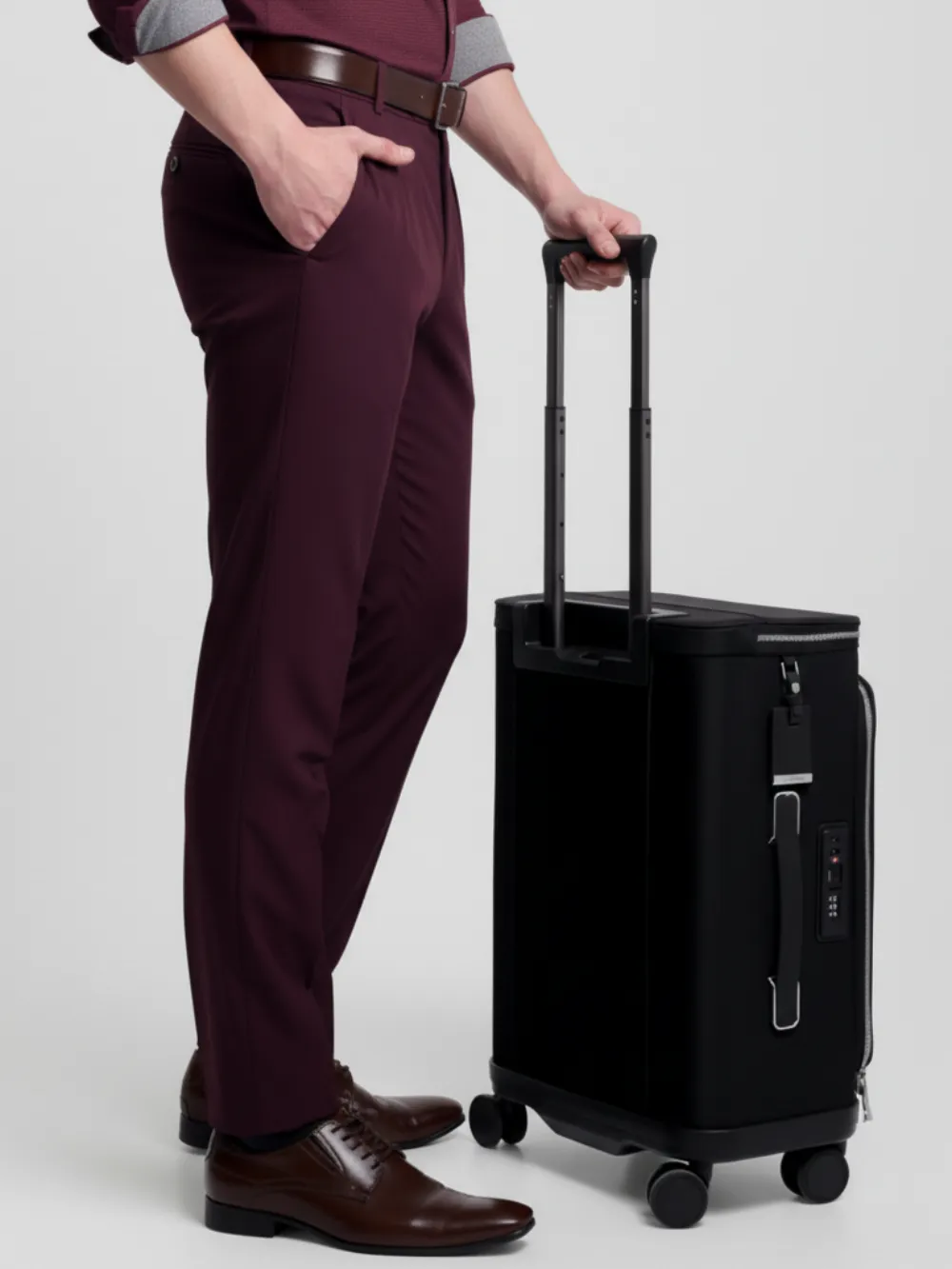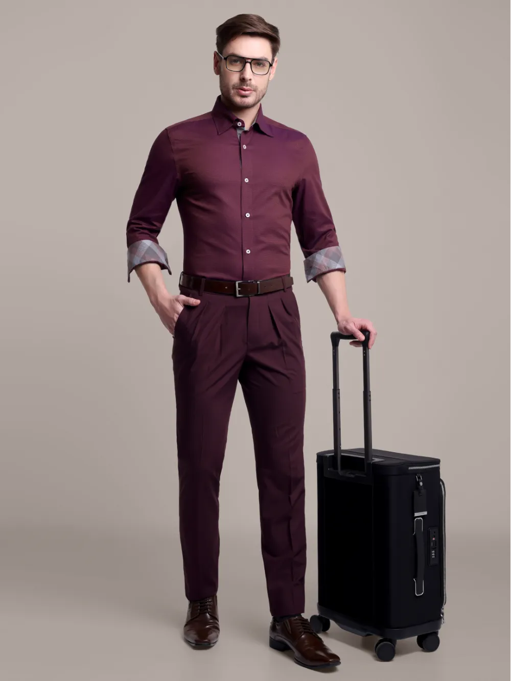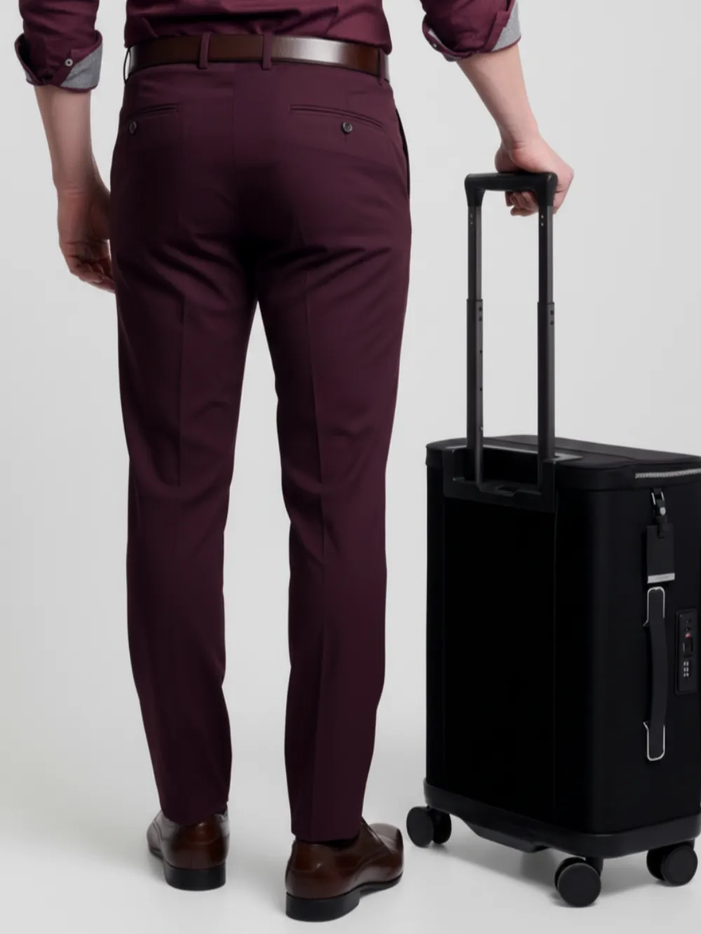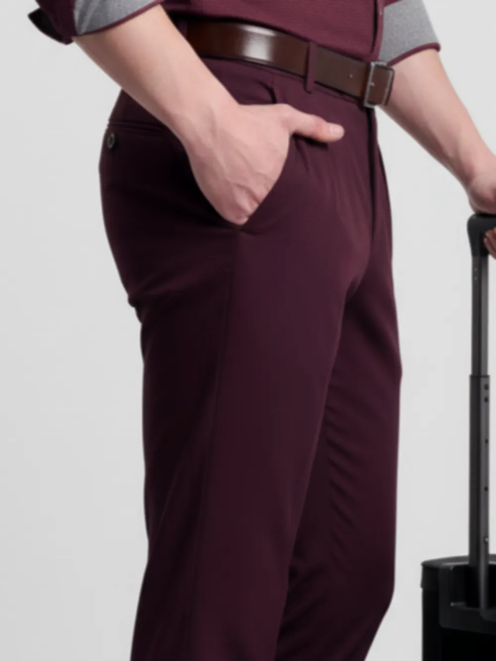 Crafted from a luxurious micro-dobby weave, these burgundy trousers embody modern sophistication with timeless appeal. The subtle geometric texture catches the light beautifully, adding depth and refinement to the rich burgundy tone. Designed with precision tailoring, they feature a flattering slim silhouette, pleated front detailing, and welted back pockets that ensure both elegance and practicality. The premium fabric offers a perfect balance between structure and comfort, making these trousers ideal for long days that transition seamlessly into stylish evenings.