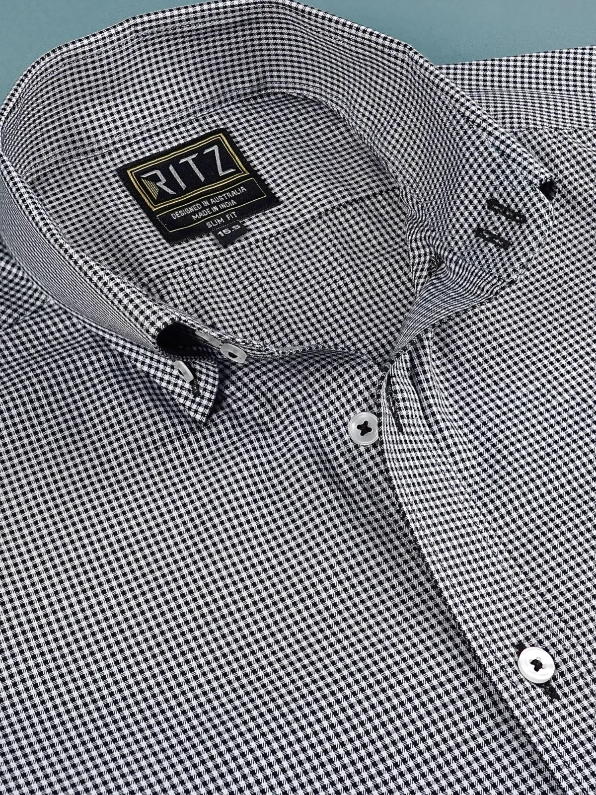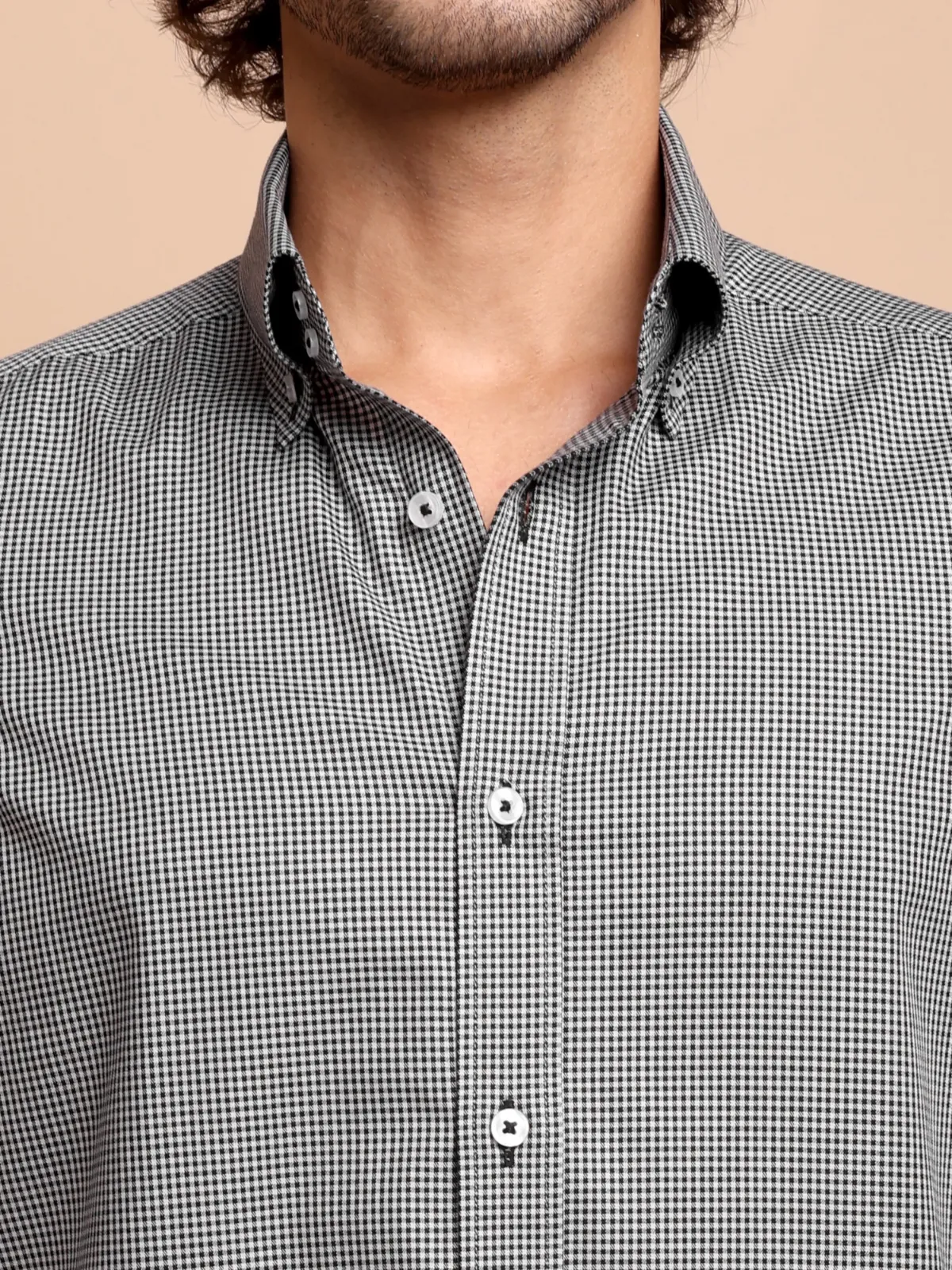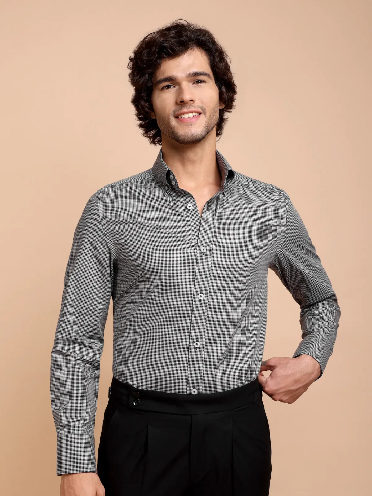 This shirt boasts of black and white grid, finely woven with a classic twill weave that showcases hound?s tooth pattern that is well appreciated across the world. The wider button down collar points and broader cuffs create a bolder look, while the combination of classic colours keeps the elegant statement intact.