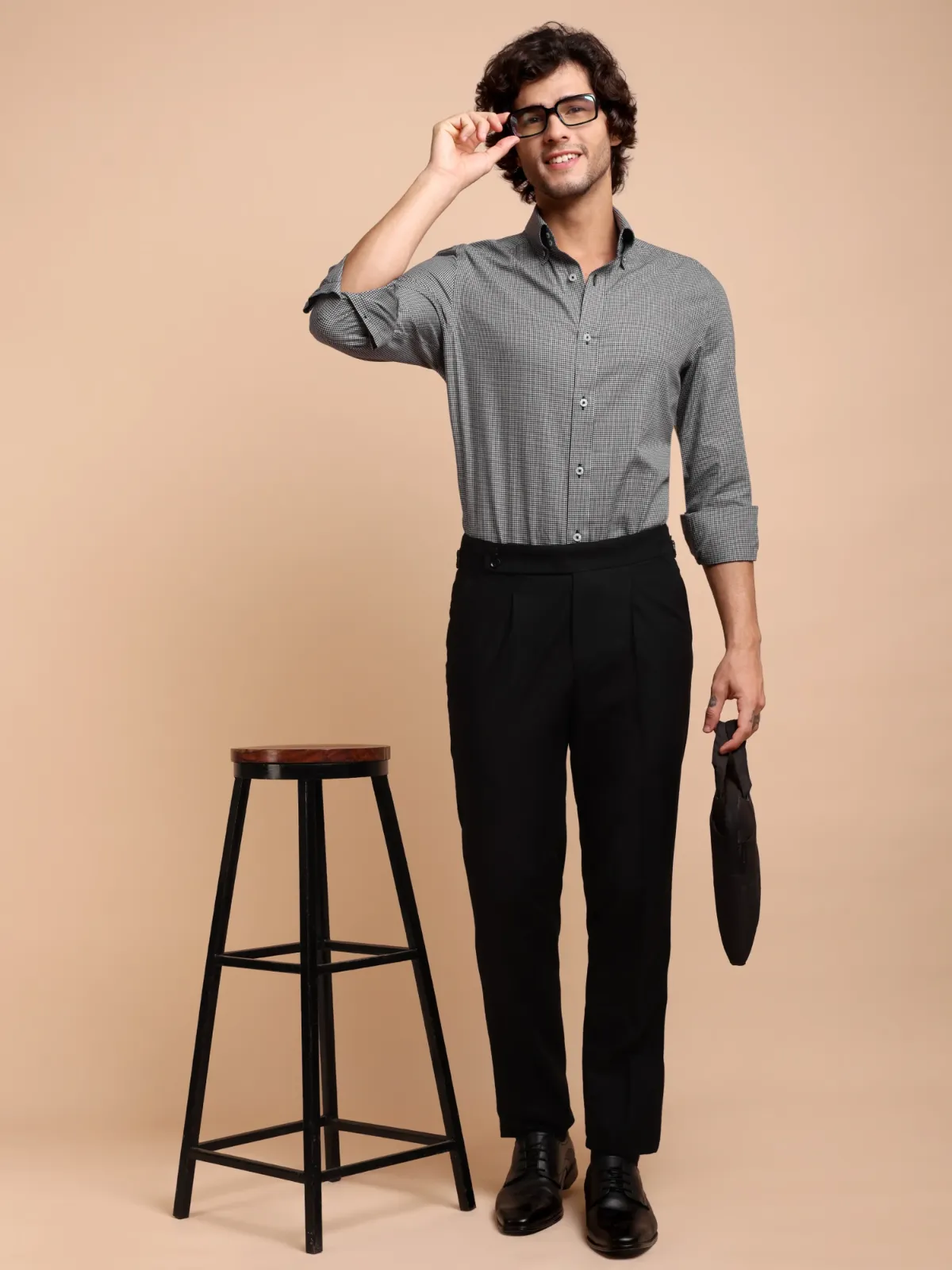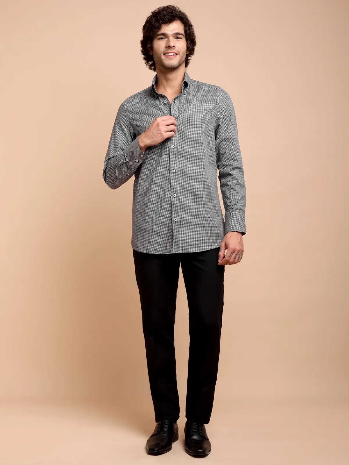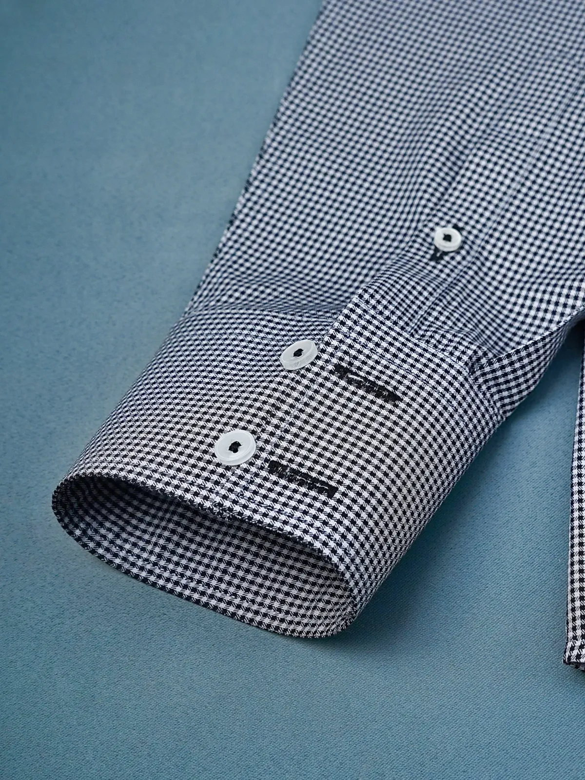 This shirt boasts of black and white grid, finely woven with a classic twill weave that showcases hound?s tooth pattern that is well appreciated across the world. The wider button down collar points and broader cuffs create a bolder look, while the combination of classic colours keeps the elegant statement intact.