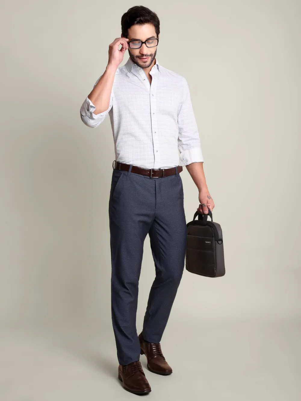 Indulge yourself in ultimate sophistication with our twill weave pure cotton shirt, featuring yarn-dyed checks, a contrast white inside band, and distinct sky blue Oxford fabric piping. Meticulously rafted, it exudes timeless sophistication.