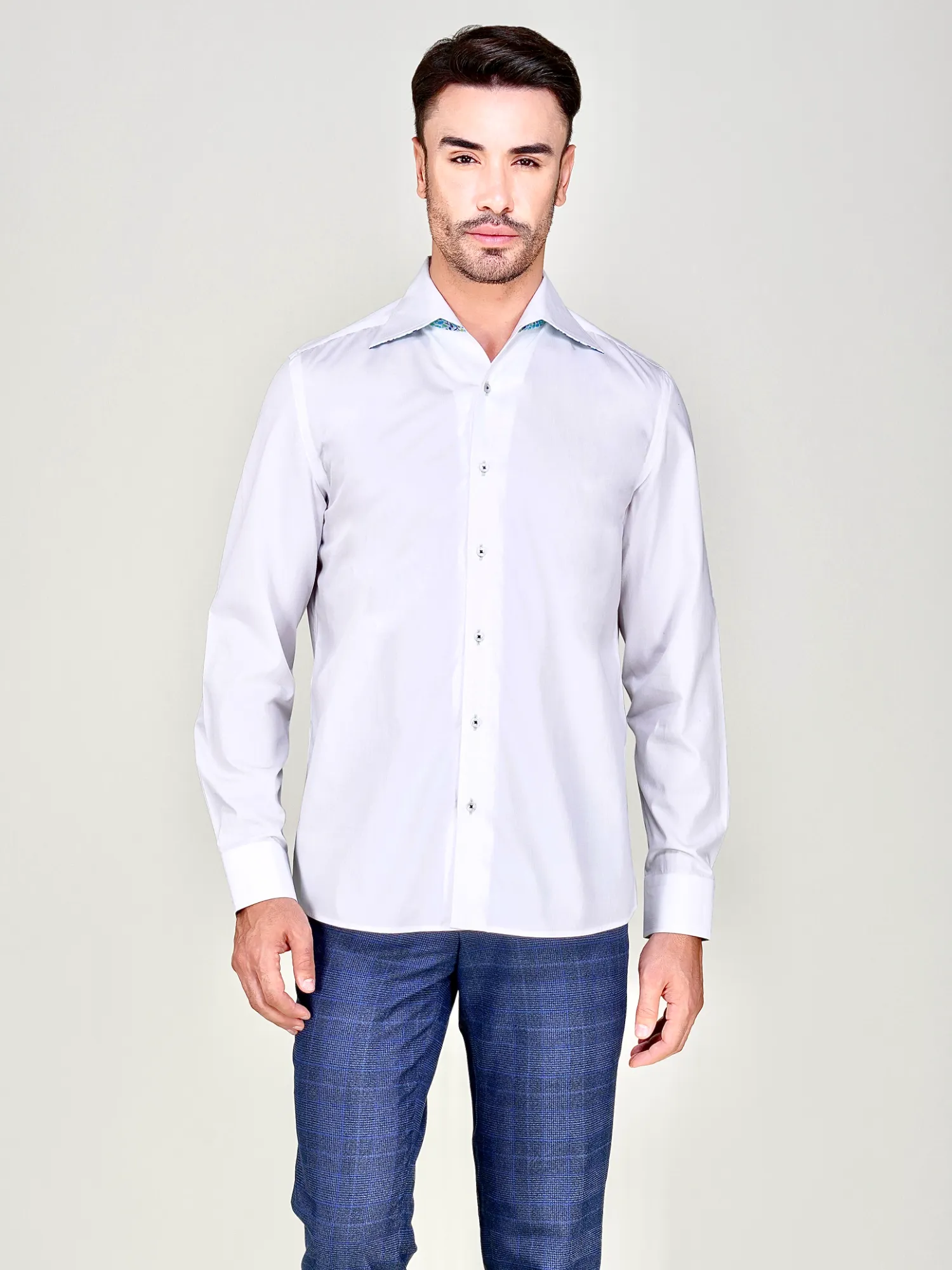 Ritz The Label Signature Japanese Crepe Satin Blend One Piece – California Collar Shirt is designed with ultimate sophistication of white with a tinge of joyful colors that creates an unmatched style and a unique statement. The classic self pin-strips created by rib weave, a unique version of plain weave but stronger. White pure cotton fabric is known for its appeal for elegance whereas the satin fabric with colorful fine petals print provides, this unique piece, its unique style. The California Collar is created with one piece collar method so that no seamline is visible on the inside of the collar – running from placket to placket demanding profound knowledge, skills and patience of experienced artisans. The colors of button, buttonhole and the button thread is chosen carefully to complement the blended fabric colors.