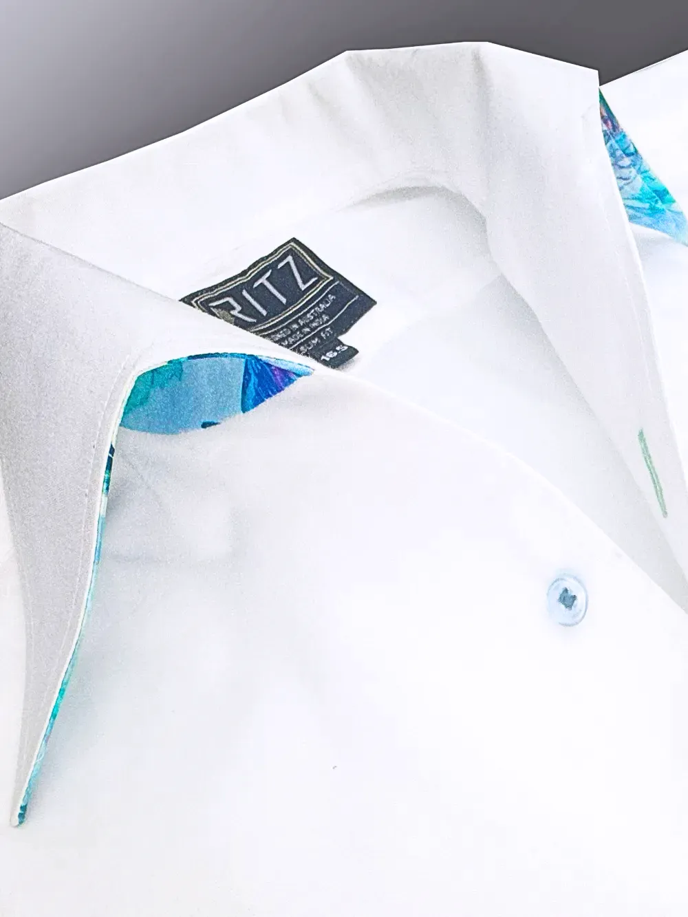 Our Signature Japanese Crepe Satin Blend One Piece – California Collar Shirt is designed with ultimate sophistication of white with a tinge of joyful colors that creates an unmatched style and a unique statement. The classic twill weave white pure cotton fabric is known for its appeal for elegance whereas the satin fabric with colorful butterfly print provides, this unique piece, its unique style. The California Collar is created with one piece collar method so that no seamline is visible on the inside of the collar – running from placket to placket. The colors of button, buttonhole and the button thread is chosen carefully to complement the blended fabric colors.