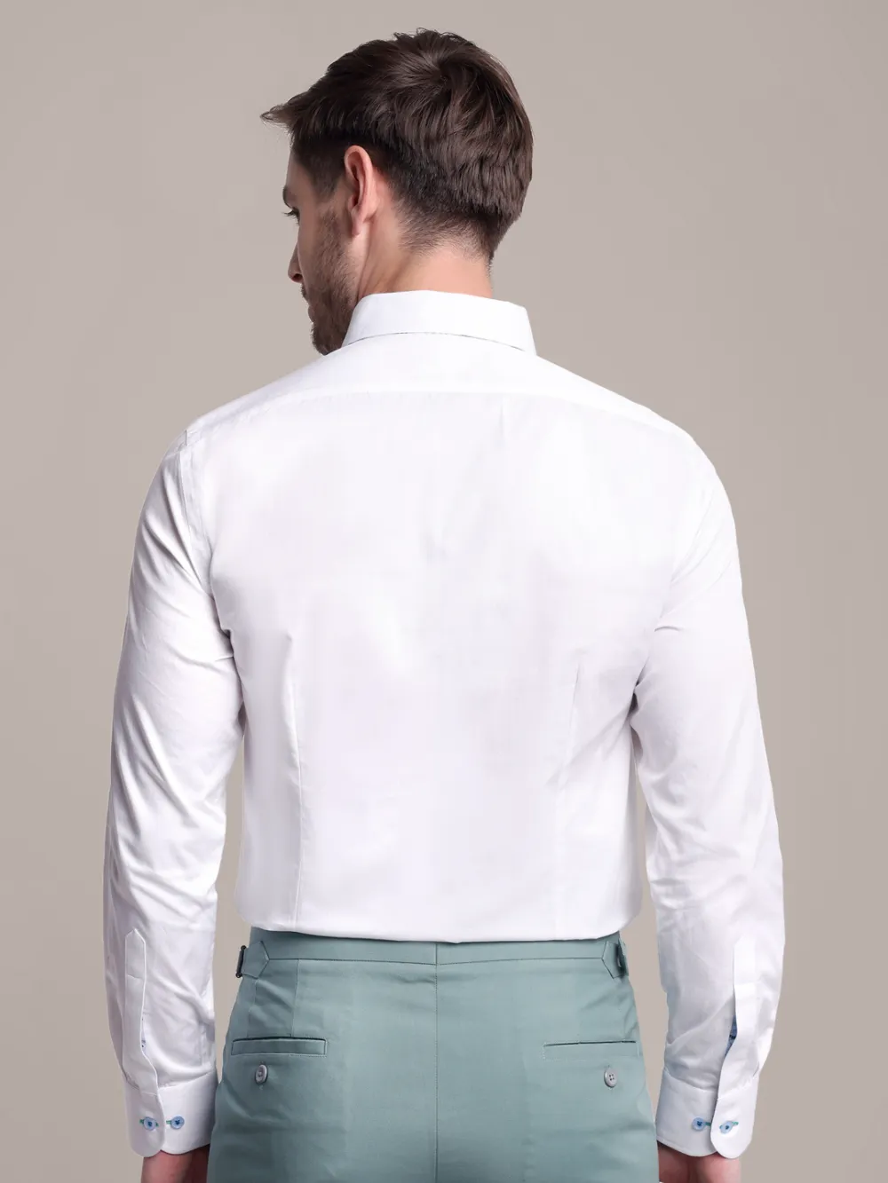 Indulge in ultimate luxury with this designer men’s white shirt, crafted from a refined twill weave cotton enhanced with Japanese crepe satin. This unique fusion of fabrics brings together a touch of sophistication and an elegant drape. Subtle yet distinctive color accents elevate its timeless appeal, making it a statement piece for any discerning wardrobe.