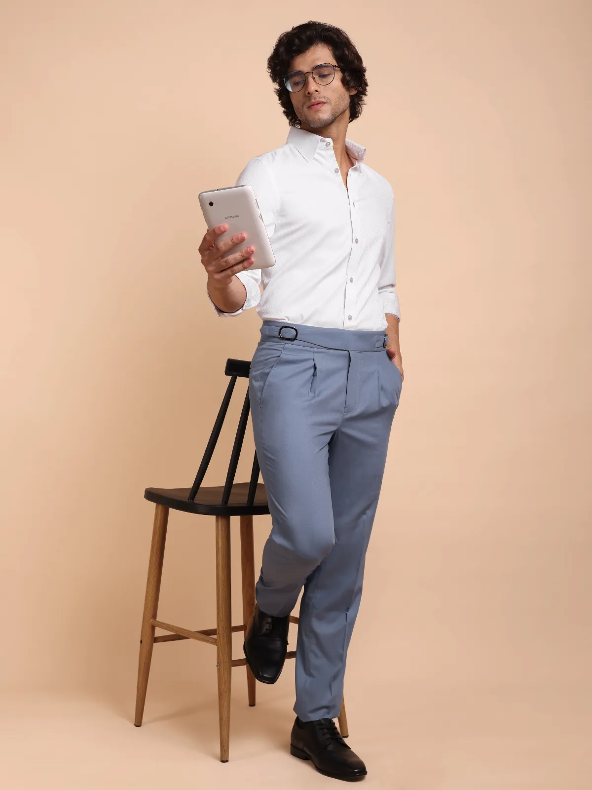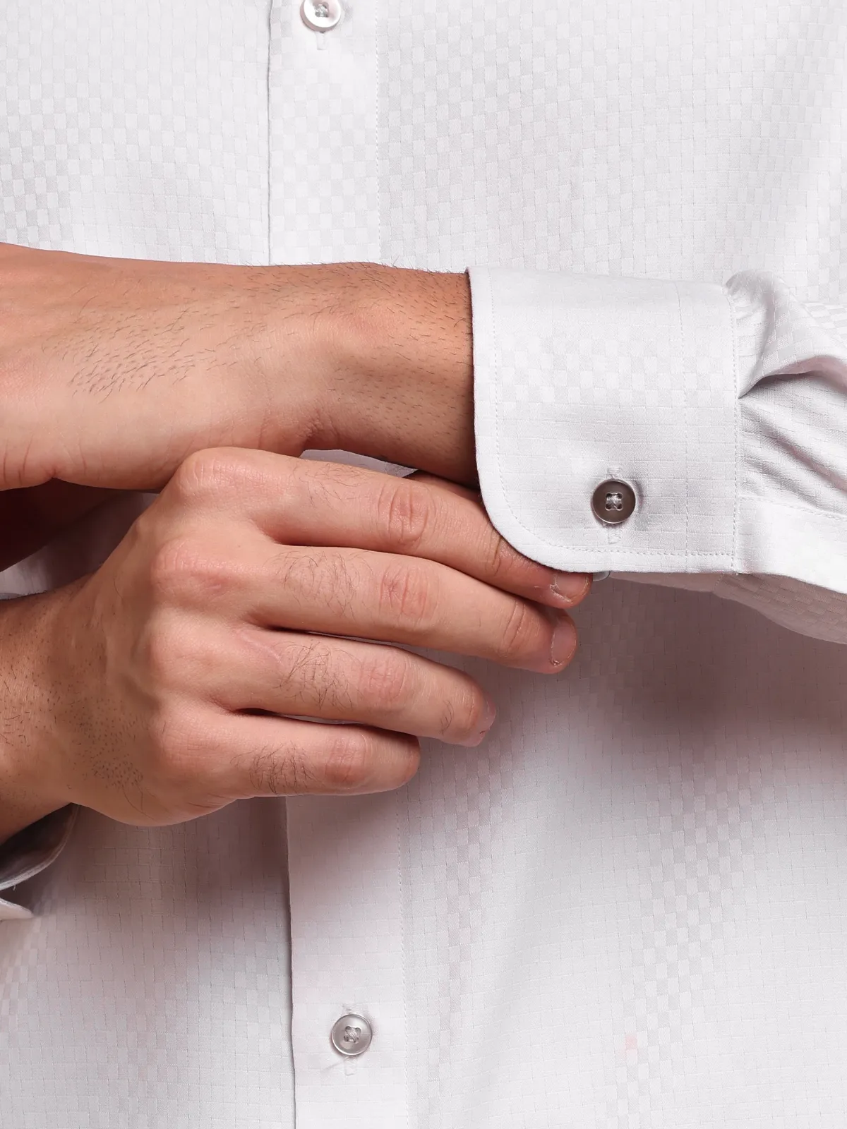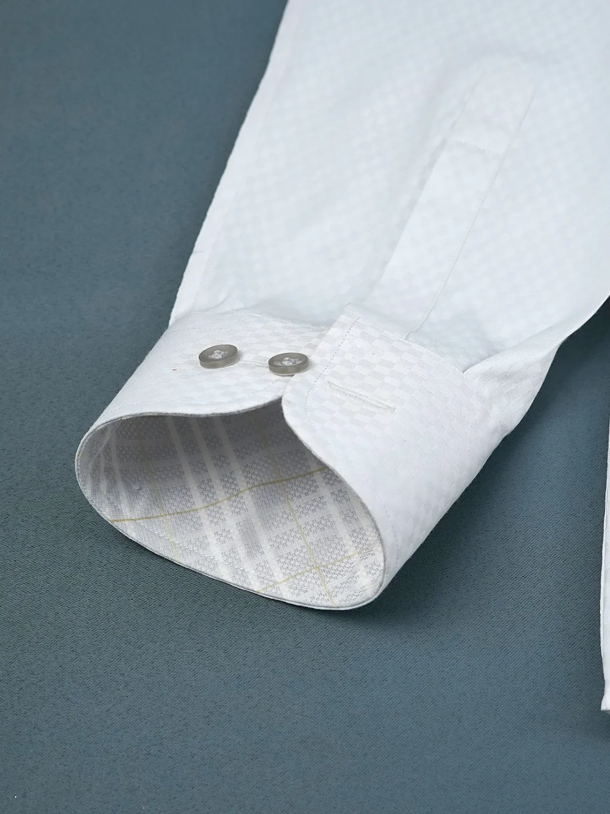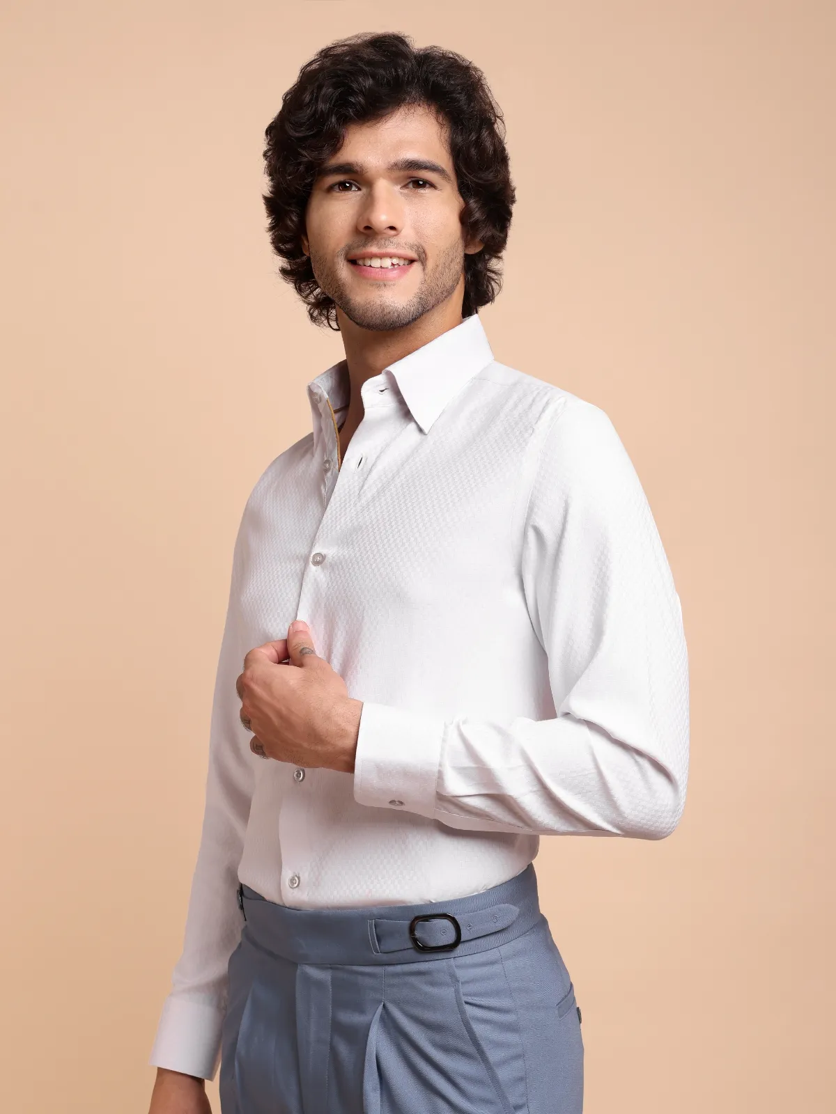 This refined white dress shirt from Ritz The Label is a modern classic, tailored for the discerning gentleman. Woven from a premium blend of fine cotton and eco-friendly fibres, the fabric showcases a subtle dobby texture that adds depth without overwhelming the design. The standout feature lies in its detailing: a contrast checked fabric lines the inner collar band, button placket, and inside cuffs, tastefully accented by a rich gold piping. Finished with lustrous buttons and precision tailoring, this slim-fit shirt balances quiet luxury with expressive personality.